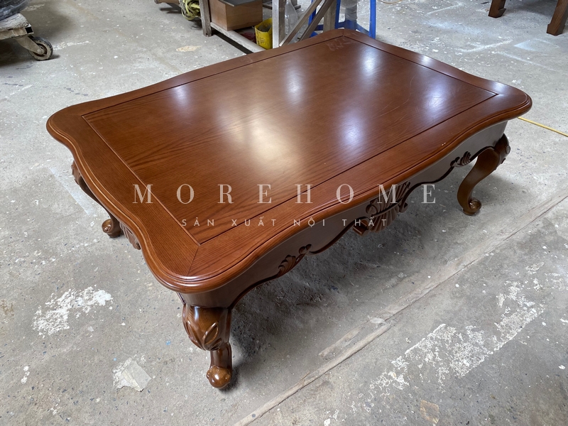 Mẫu nội thất bàn trà gỗ tự nhiên tân cổ điển từ xưởng sản xuất nội thất Morehome tỉ mỉ từng chi tiết, chạm khắc cầu kì thẩm mỹ, được ưa chuộng sử dụng nhiều trong không gian phòng khách sang trọng