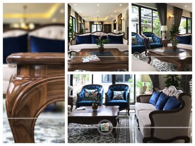 Ghế sofa gỗ óc chó có nét nghệ thuật theo phong cách tân cổ điển, được kết hợp với vỏ bọc da cao cấp, rất phù hợp với phòng khách biệt thự, nhà phố.